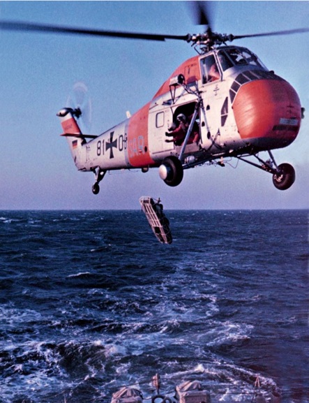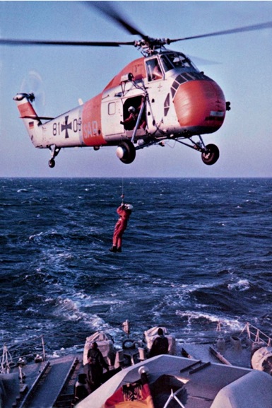 Der Smut hatte sich bei schwerem Seegang ein Küchenmesser in den Bauch gerammt ! Notarzt abseilen, den kranken Patienten versorgen, schnell hochhieven und ganz flott ab ins Lazarett. Damit das Manöver auch