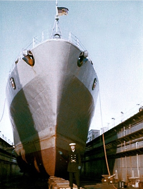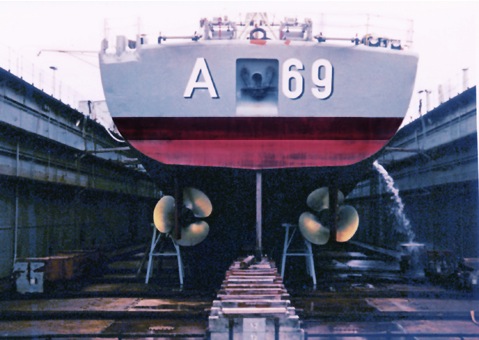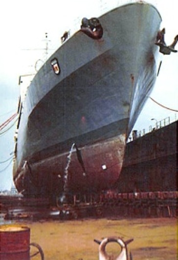 Diese Wache bockte absolut gar nicht,.......!!! Das Heck der Donau mit den 2 Schrauben. Boh ey, was für Propeller !!! Bug mit diversen Beulen von unten gesehen
